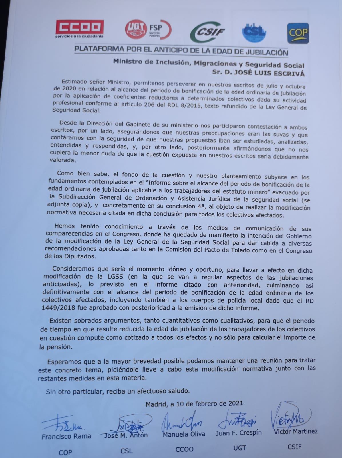 LA PLATAFORMA NACIONAL POR EL ANTICIPO DE LA EDAD DE JUBILACIÓN Y LA PLATAFORMA SOCIAL DE POLICÍAS LOCALES INFORMA: