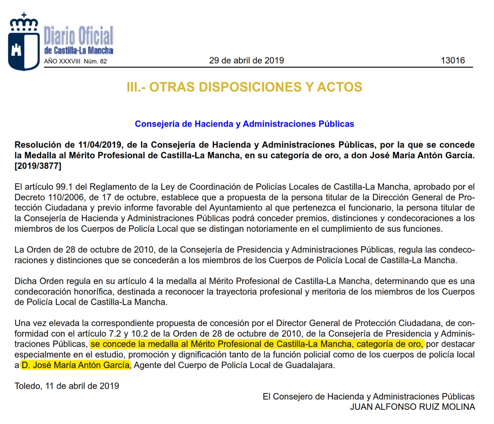 La Consejería de Hacienda y Administraciones Públicas, por Resolución el 11/04/2019,