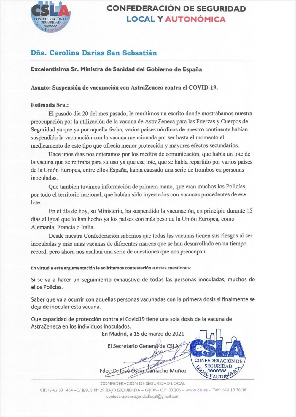 Adjuntamos escrito remitido desde CSLA al Ministerio de Sanidad con el fin de conocer el desarrollo de la vacunación con Astrazeneca en los integrantes de nuestro colectivo así como la problemática relacionada con la misma.Con lo que vayamos conociendo al respecto continuaremos informando.