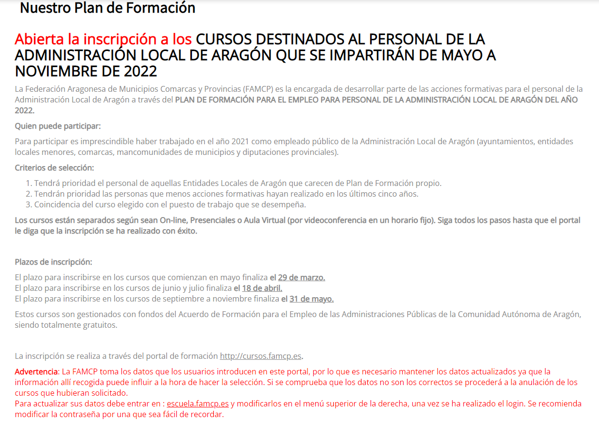 Se ha abierto el plazo de inscripción para los cursos formativos gratuitos para el personal de la Administración Pública que organiza la Federación Aragonesa de Municipios, Comarcas y Provincias.