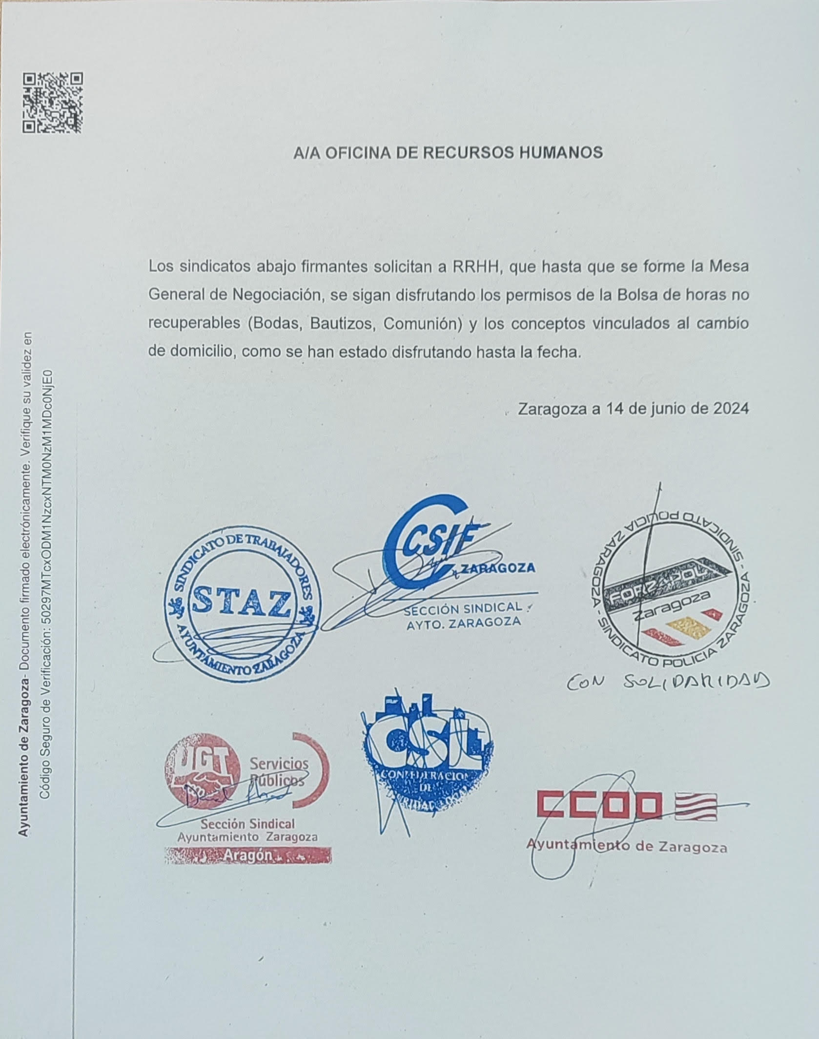 Tras esta solicitud y otra posterior realizada por los sindicatos no firmantes del “Acuerdo”, os podemos informar que es ya una realidad en el Ayuntamiento de Zaragoza, ya se está concediendo, de momento de forma no retribuida…