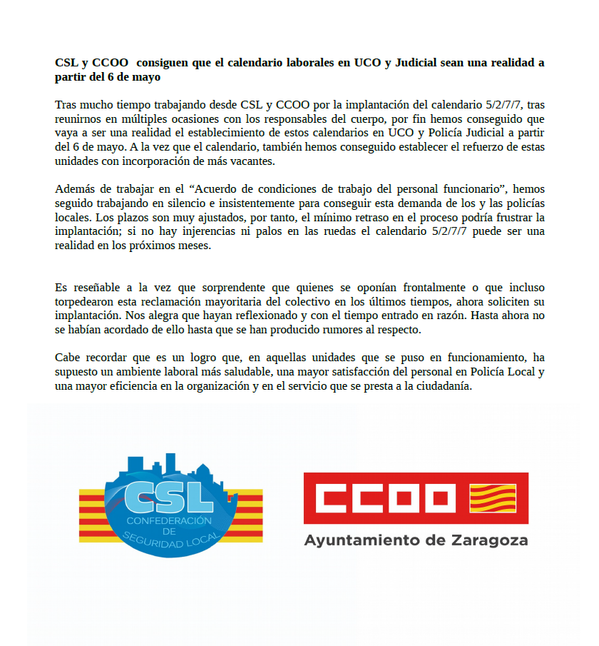 Hoy hemos tenido conocimiento, por desgracia y tristemente, de que estos sindicatos (en la actualidad STAZ, UGT y Solidaridad-Forzapol) están queriendo boicotear dentro del colectivo, contribuyendo con sus falsedades a generar miedo y así impedir la cobertura de vacantes, concreta y únicamente en UCO y Judicial, para que no se aplique el calendario que tanto hemos luchado desde CSL. Podéis comprobar este hecho hablando con los compañer@s.