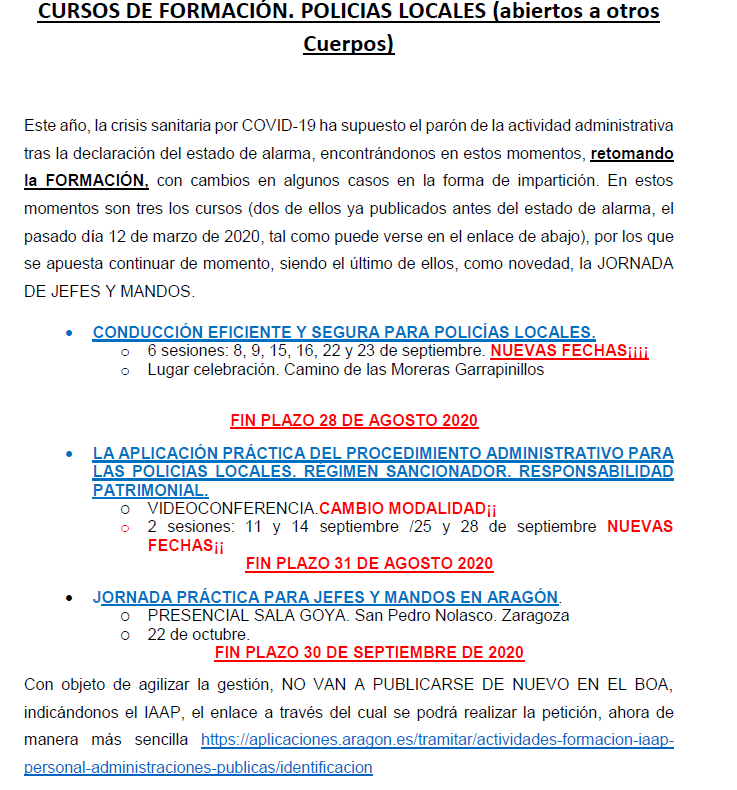 Desde la DGA y con motivo de la crisis sanitaria con objeto de agilizar plazos se han convocado los cursos que se adjuntan en pdf sin publicación en BOA y variando la forma de inscripción, siendo ahora más sencilla, algunos de ellos finaliza su inscripción el día 28 DE AGOSTO.