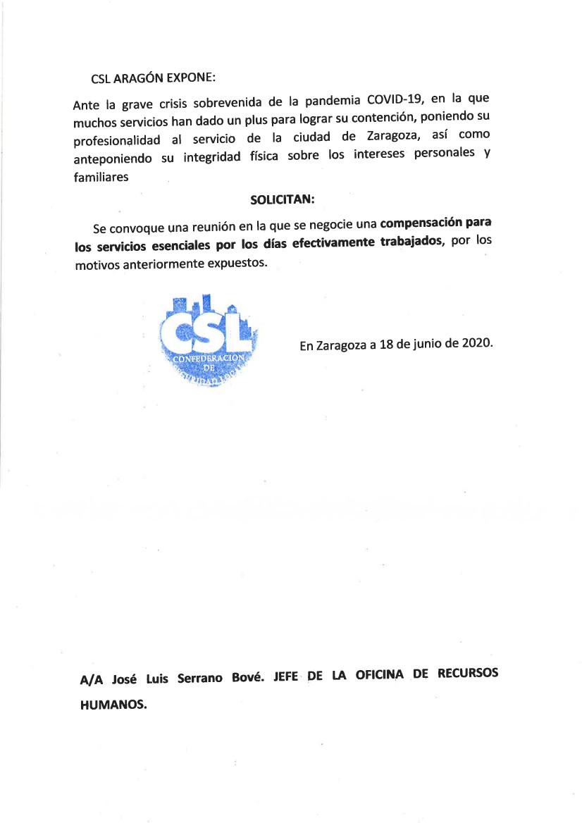 El pasado viernes 19 de junio, CSL, dando cumplimiento a los expuesto en el "Informa" de fecha 21/04/2020 "COMPENSACIÓN USN-USI", registró una solicitud para que se negocie una COMPENSACIÓN A LOS SERVICIOS ESENCIALES que han puesto su profesionalidad al servicio de la ciudad de Zaragoza, anteponiendo su integridad física sobre intereses personales y familiares durante el estado de alarma causado por la grave crisis COVID-19.