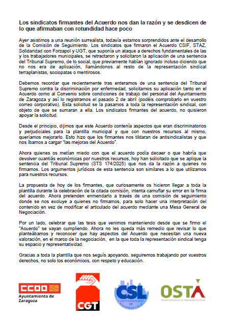 Tras enterarnos de la Sentencia del Tribunal Supremo contra la discriminación salarial por enfermedad, solicitamos su aplicación tanto en el Acuerdo como al Convenio sobre condiciones de trabajo del personal del Ayuntamiento de Zaragoza y así lo registramos el pasado 2 de abril (podéis comprobarlo en vuestro correo corporativo).