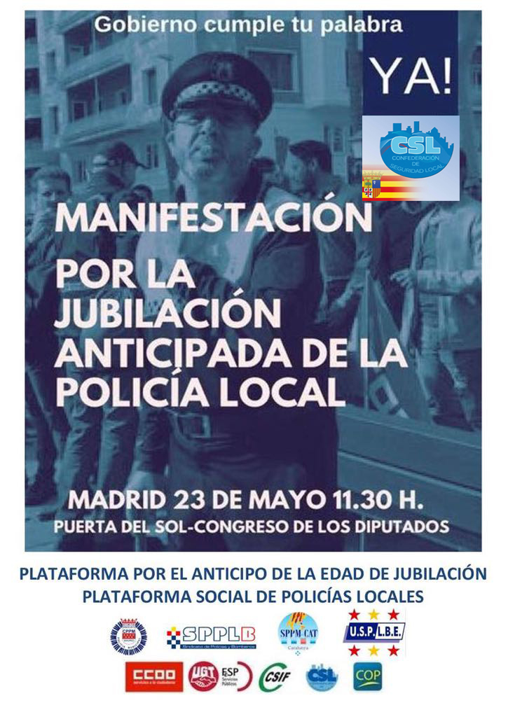 La Plataforma Nacional por el Adelanto de la Edad de Jubilación convoca una manifestación conjunta para el próximo 23 de mayo en Madrid. La coordinación y suma de fuerzas, al integrar a la práctica totalidad de la representación sindical de los policías locales, reclama al gobierno la aprobación del Real Decreto que reconozca el Adelanto de la Edad de Jubilación de los Policías Locales y Autonómicos. Después de muchos años de reivindicación y esfuerzos tenemos que dar el último paso, y necesitamos tu participación en la Gran Manifestación Conjunta de Madrid.